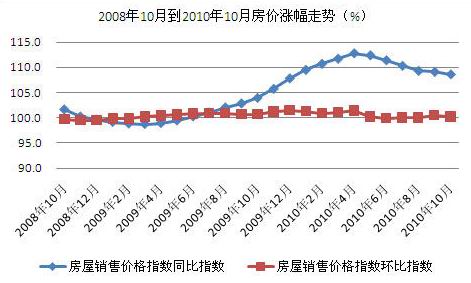 10月份,新建住宅銷售價(jià)格同比上漲10.6%,漲幅比9月份縮小0.7個(gè)百分點(diǎn);環(huán)比上漲0.3%。其中,商品住宅銷售價(jià)格上漲11.9%,其中普通住宅銷售價(jià)格上漲11.0%,高檔住宅銷售價(jià)格上漲14.8%;經(jīng)濟(jì)適用房銷售價(jià)格上漲0.9%。與上月相比,商品住宅銷售價(jià)格上漲0.3%,其中普通住宅銷售價(jià)格上漲0.4%,高檔住宅銷售價(jià)格上漲0.2%;經(jīng)濟(jì)適用房銷售價(jià)格下降0.1%。
